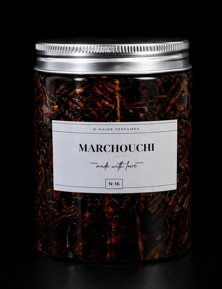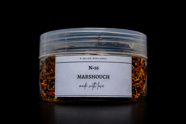 Élaboré à partir de bois de santal soigneusement travaillé, effilé en fins filaments dorés et ambrés d’une élégance visuelle saisissante, le Marchouch de R-Maine Perfumes est autant un objet de beauté qu’une expérience olfactive d’exception.